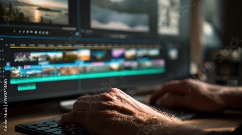 A close-up of hands editing a video on a computer, focusing on the timeline and preview screen in a dimly lit room.
