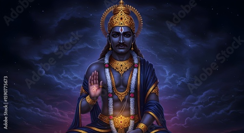 Cosmic-themed background portraying Lord Shanidev with deep blue tones and radiant aura, symbolizing justice and planetary influence