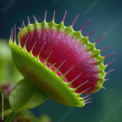 A stunning macro photograph captures the vibrant red interior and sharp green teeth of a venus flytrap s open trap