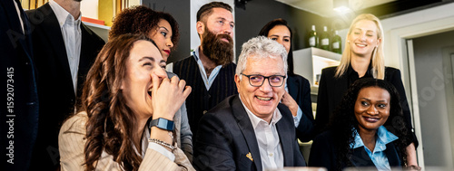 Multiracial business team sharing laughter and positivity during a casual office meeting. Real joy, connection, and authentic human interaction in a modern corporate setting. Team bonding concept.