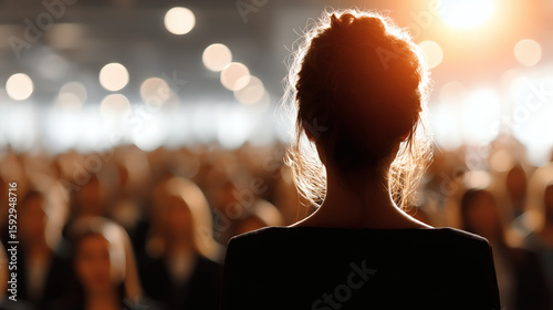 Mujer de espaldas frente a multitud en evento profesional al aire libre