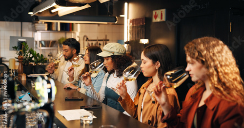 Restaurant, friends and smell glass at wine tasting for experience, flavor preparation and bonding. Night, people and alcohol aroma at pub venue for quality testing, weekend break or social gathering