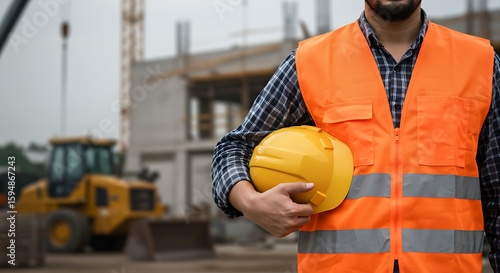 Construction worker in orange safety vest holding yellow hard hat at job site