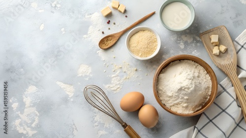 Fresh baking ingredients like flour, eggs, milk, and butter are neatly arranged on a dusty kitchen counter, ready for delicious homemade recipes.