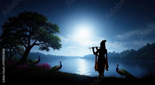 Silhouette of Lord Krishna Playing Flute – Night Sky Krishna Wallpaper HD