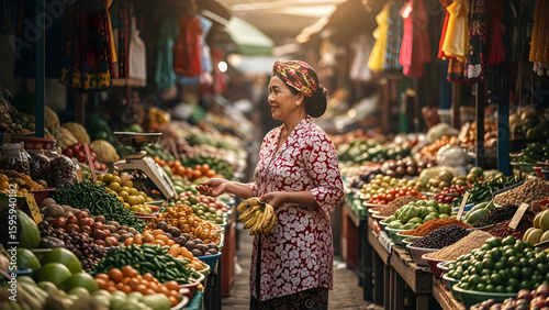 A genuine smile from an attractive older female vendor, surrounded by a colorful array of fresh produce at a vibrant traditional Asian market.