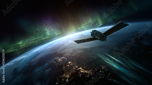 A long-distance view of a sleek orbital satellite flying above the aurora-lit Northern Hemisphere, with atmospheric glow and shadows shifting naturally across its frame
