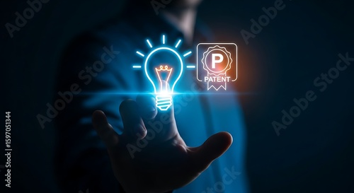 Patent registration concept. A hand holds a glowing holographic lightbulb icon with a small, simple "P" seal, symbolizing a patented idea.