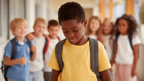 Isolated Boy in Yellow Shirt, Sad and Alone in a Crowded School Hallway