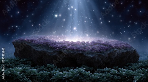A large rock covered in tiny purple flowers sits amidst foliage under a starry night sky with light beams