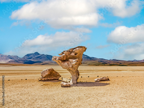 Arbol de Piedra (tree of rock), the famous stone tree rock formation created by wind, in the Siloli desert in Bolivia