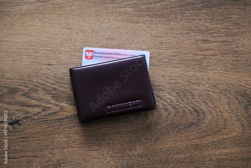 Portfel z ciemnej skóry z wystającą polską kartą identyfikacyjną (Dowód Osobisty) leżący na drewnianym stole. Widoczne słowo "DOKUMENTY" wytłoczone na portfelu. Zdjęcie przedstawia ważne dokumenty os