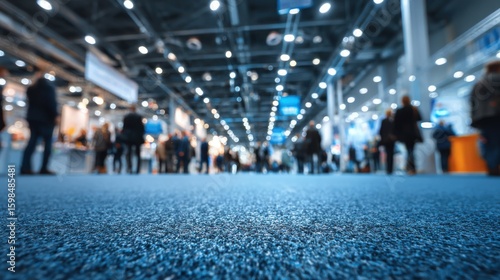 In a busy trade show venue, people are seen mingling and walking across a carpeted floor, surrounded by colorful displays and bright lights overhead.