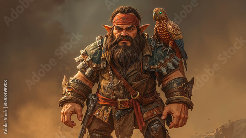 Fierce Dwarf Warrior with Parrot Companion