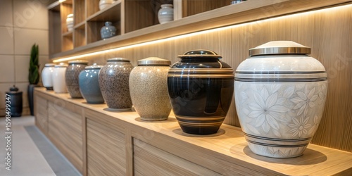 Row of cremation urns for ashes on wooden shelf, each showcasing unique design. Cremation urns are thoughtfully arranged and positioned for aesthetic appeal