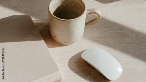 A minimalist workspace featuring a beige mug, a white computer mouse, and a light-colored notebook on a wooden desk.