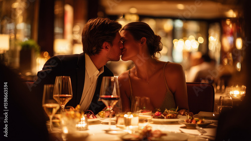 Zakochana para na randce w eleganckiej restauracji. Romantyczna atmosfera, świeczki, wykwintne dania i czuły pocałunek w wyjątkowym otoczeniu.
