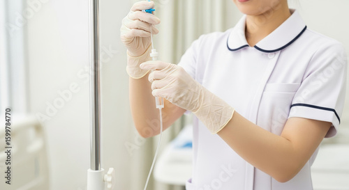 点滴を調整するアジア人看護師の手元