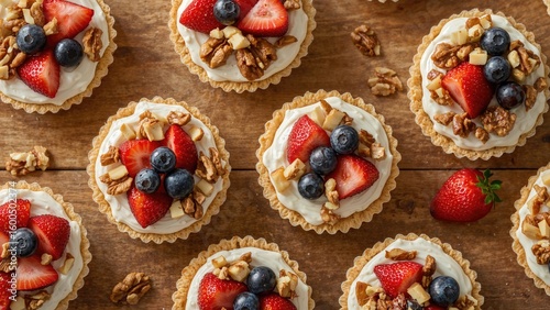 Assorted mini cupcakes and fruit tarts featuring strawberries, nuts, and blueberries arranged on a wooden table. Top-down perspective, detailed view