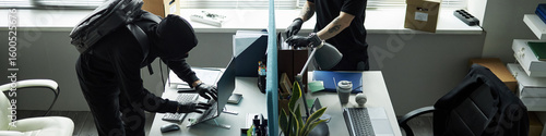 Header of two young men wearing black clothing, masks and gloves, breaking into modern office workspace, searching through desks and hacking laptops, committing theft and cybercrime
