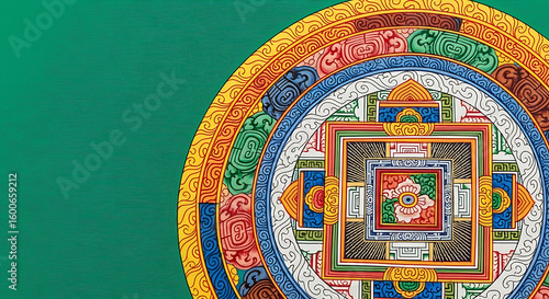 Detailed close-up of a colorful and intricate Tibetan Buddhist mandala with geometric patterns, decorative elements, and vibrant hues against a green background.