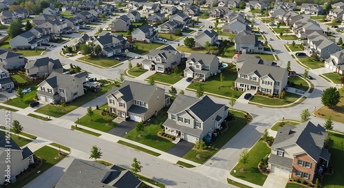Aerial scene of typical American new construction neighborhood street in Maryland for the upper middle class, single family residences USA real estate