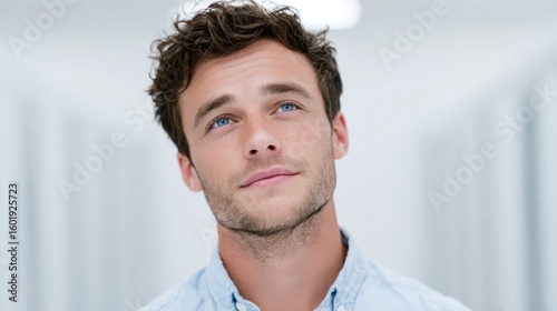 A young man with curly brown hair and blue eyes looks up thoughtfully Male