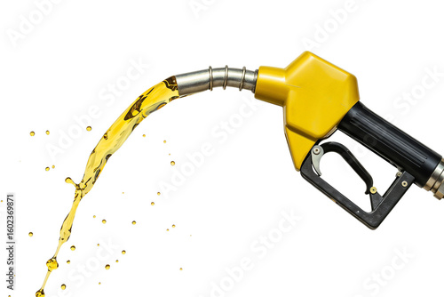 Fuel nozzle pouring gasoline with yellow liquid on white background