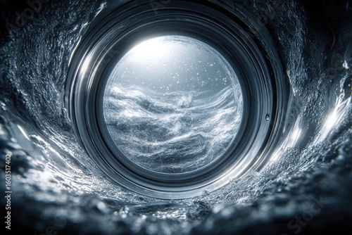 Abstract view of a washing machine drum with spinning motion creating a effect and water turbulence inside the appliance