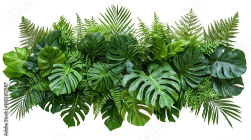 Lush tropical foliage arrangement with various green leaves isolated on transparent background