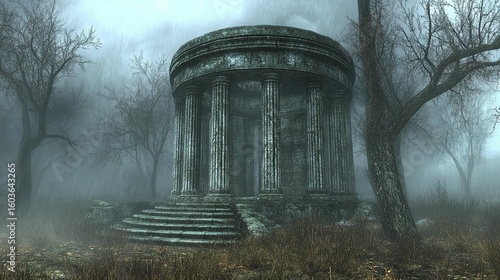 Fog-shrouded, ancient stone rotunda in a misty forest