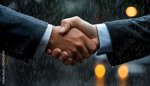 Business Handshake in the Rain Symbolizing Trust, Commitment, and Partnership Through Adversity