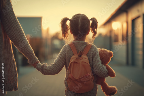 Mama odprowadza córkę do przedszkola. Trzymają się za rękę, a dziewczynka w drugiej ręce tuli swojego ulubionego misia. Czułość, troska i codzienna rutyna.