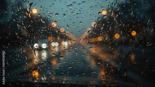 Close-up view of a vehicle glass dotted with raindrops amid a downpour