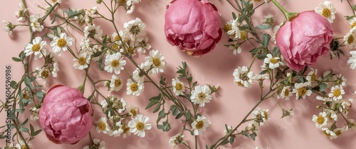 Realistic peony clusters and chamomile stems with dainty buds and eucalyptus accents centered on a blush pink background