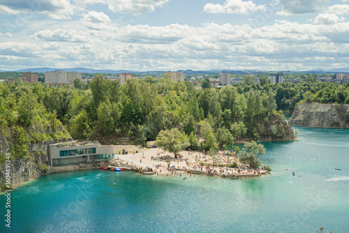 kąpielisko pośród skał wapiennych z błękitną wodą w letni słoneczny dzień