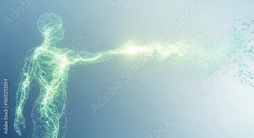 A glowing green outline of a human body emits vibrant energy particles from its outstretched hand, symbolizing digital health, healing energy, biotechnology, human potential, and scientific advancemen