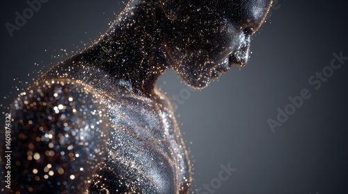 Side profile of a human figure with skin sparkling from microscopic toxin particles while soft gray shadows form organ shapes inside depicting the hidden effects of uremic syndrome.