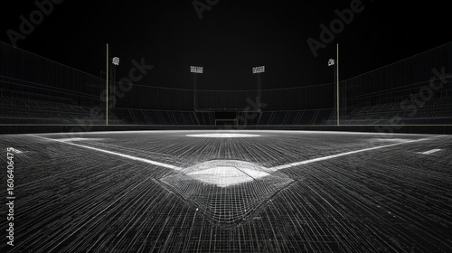 A nighttime, monochrome view of a mostly empty baseball field, showing the pitcher's mound, home plate, and bases, set against a dark background with stadium lighting faintly visible