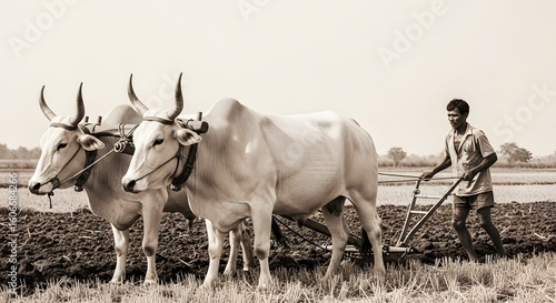 A farmer plowing a field with two oxen in a sepia toned image showing traditional agricultural methods