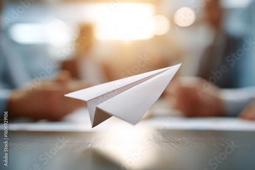 Paper plane descends gracefully during a meeting with focused participants engaged in discussion
