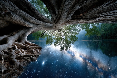 Majestic tree reflected in tranquil water under a starry night sky in a serene landscape
