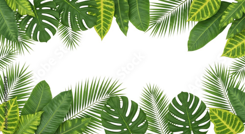 Lush green tropical leaves arranged in a decorative border with a transparent background, cutout PNG