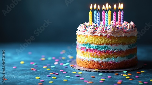 Colorful Layered Birthday Cake with Lit Candles and Sprinkles
