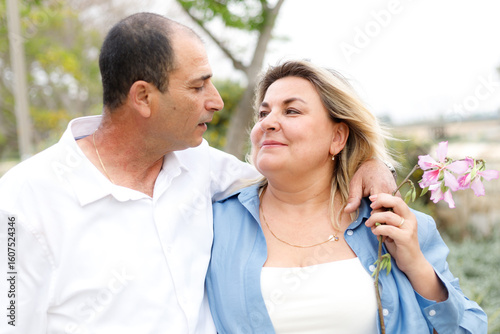 A Moroccan man and a charming plump woman enjoy each other's company while walking in the park. Marry me.