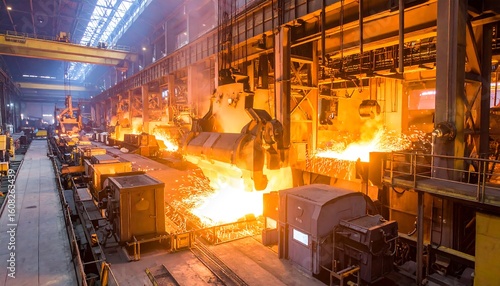Molten metal pouring in a steel mill. Large industrial hall, cranes, and machinery surround a conveyor system with fiery metal flowing