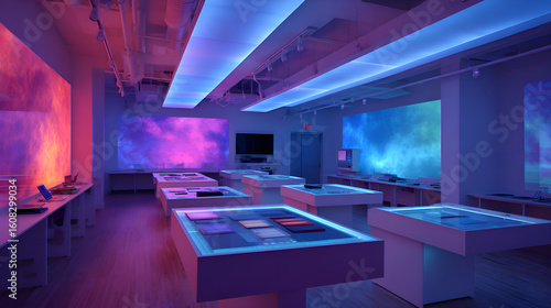 Showroom with futuristic design and interactive tables exhibiting new technologies