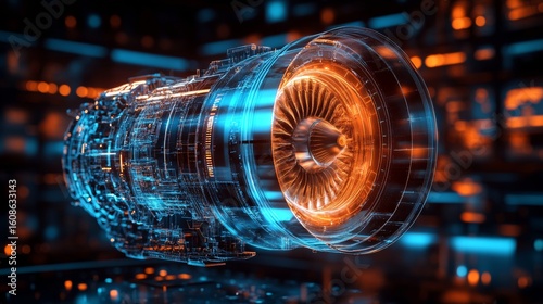 Futuristic close-up of a detailed jet engine turbine rendered in glowing blue and orange light, illustrating modern engineering, aeronautics technology, mechanics, advanced digital industrial design.