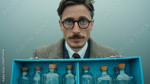Mężczyzna w okularach i garniturze, trzymający niebieską skrzynkę pełną szklanych butelek, patrzący prosto w obiektyw na szarym tle.