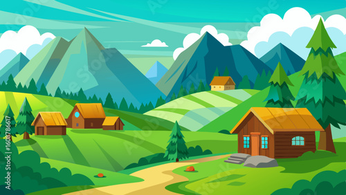 mountain green field landscape with wooden houses